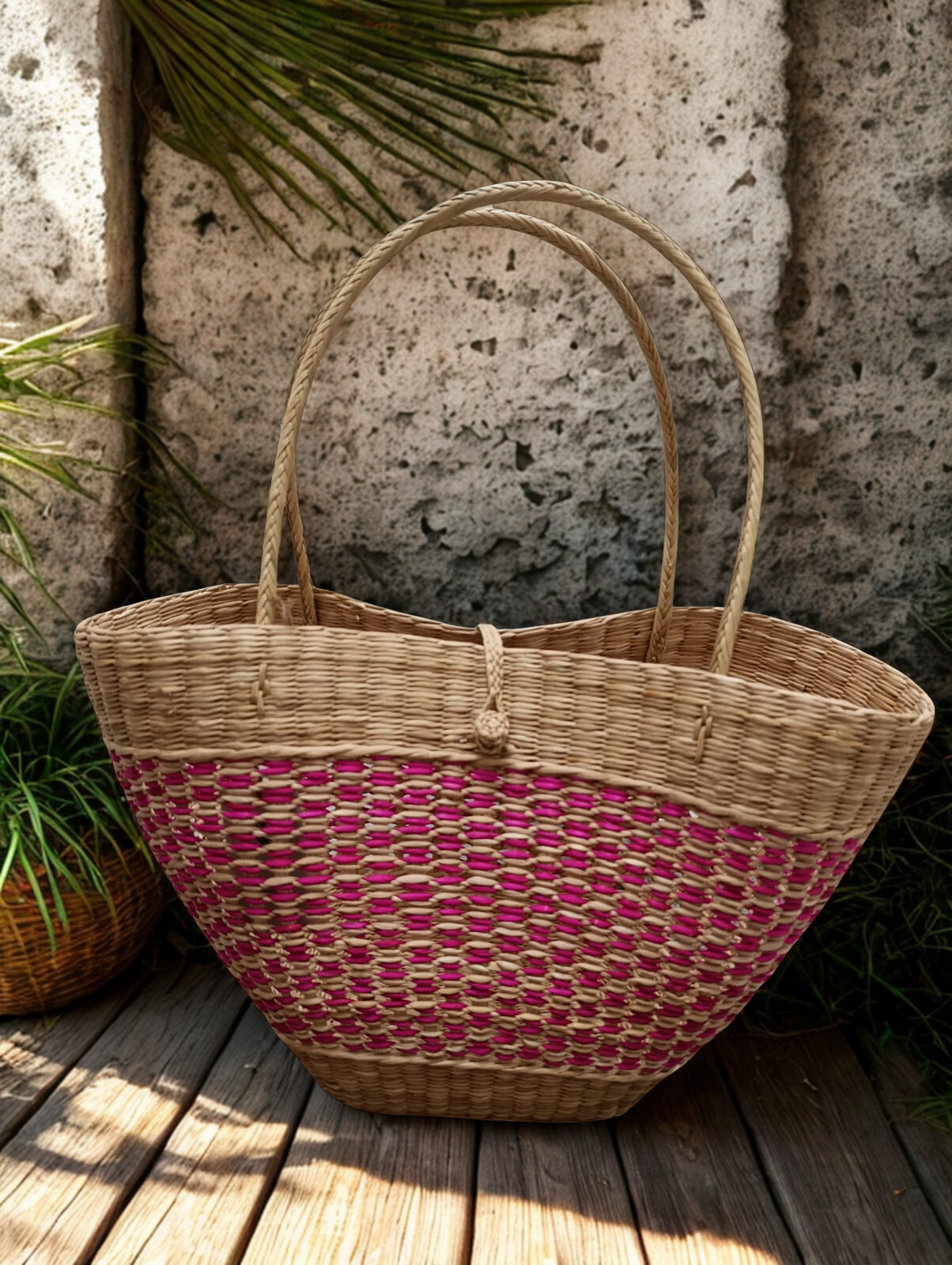 Su diseño espacioso la convierte en la compañera perfecta para un día de playa, un picnic al atardecer o simplemente para darle un toque bohemio y chic a tus paseos por la ciudad. Al ser una pieza artesanal, cada canasta es única, celebrando la belleza de lo hecho a mano.