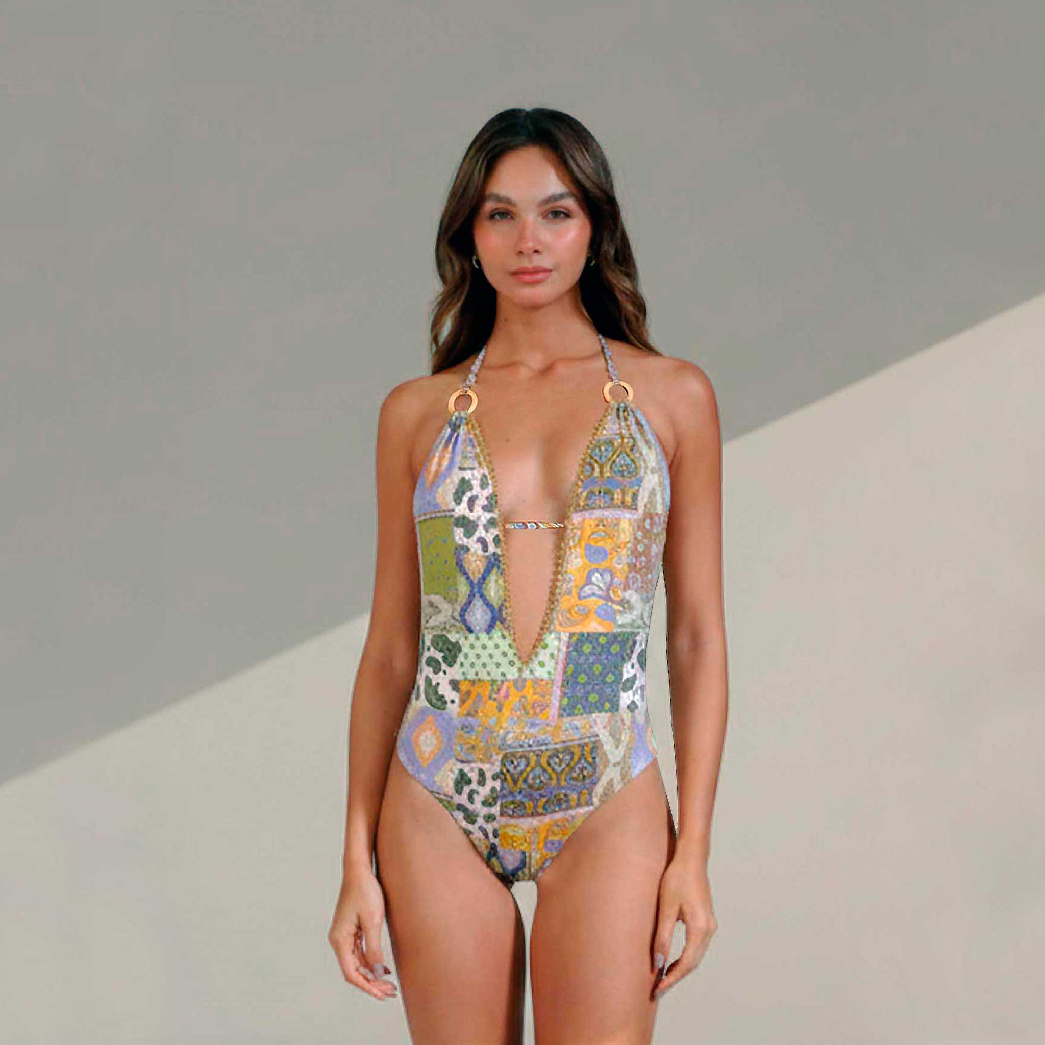 - Ajuste tipo halter con amarras al cuello